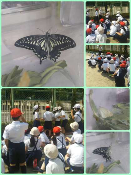 月曜日に登校すると、アゲハとモンシロチョウがサナギから成虫へと成長していて、みんな大喜び。