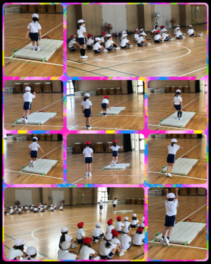 「立ち幅跳び」では、より遠くへ跳ぶ事、跳んだ後、動いてしまわない事に気を付けながら頑張っていました。