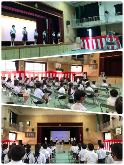 講堂で行われる式には6年生が代表して参加します。