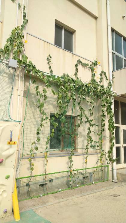 前回は、講堂の入り口付近に伸びていたヒョウタンがありましたが、今回はウォールクライミングのそばに、これまたツル状の植物が成長しています。