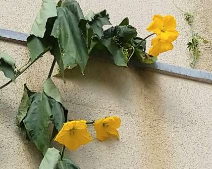黄色い花を咲かせる「ヘチマ」ですね、なんと3階の高さまで伸びています!