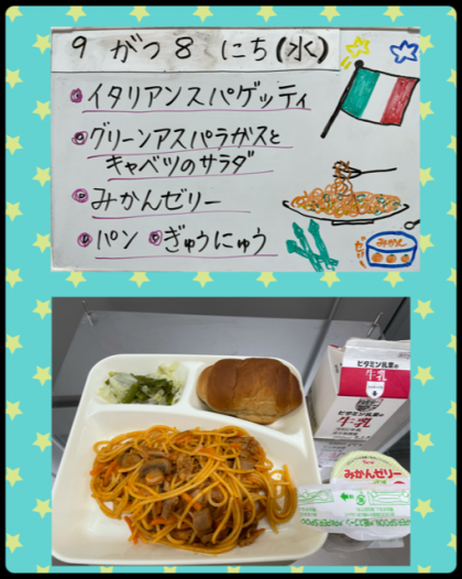 『イタリアンスパゲティ』は、豚肉、ウィンナーを主材に、たまねぎ、にんじん、ピーマン、マッシュルームを使用したケチャップ味のスパゲティです。子ども達に大好評の献立です。