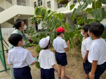 3年2組では、管理作業員さんとひまわりの実の収穫を行いました。