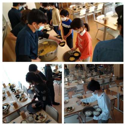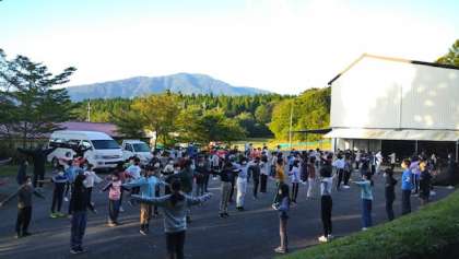 宿舎の前で、朝のつどいを行いました。空は快晴で、小鳥のさえずりが心地よく聴こえてきました。森の空気を深呼吸し、続いては朝ごはんです。