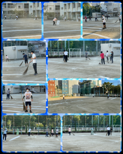 運動場の砂ぼこりがたちにくくするためににがりをまきます。