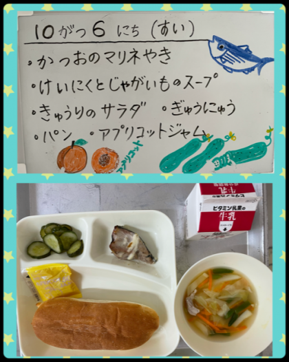 『かつおのマリネ焼き』は、卵アレルギーのある児童も食べることが出来るように、ノンエッグドレッシングを使っています。塩、こしょう、ノンエッグドレッシングで下味をつけたかつおを焼き物機で焼きます。