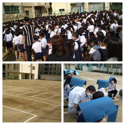 まず、1年生から6年生まで総勢700人以上の全員で、集合写真を撮りました。感染対策として、直前までマスクを着用し、撮影に臨みました。