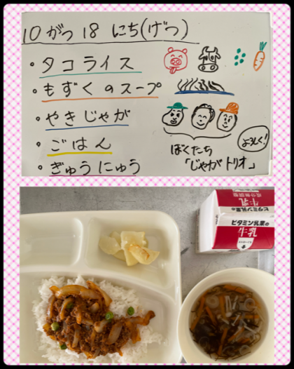 炒めたひき肉、たまねぎをカレー粉、ケチャップ、ウスターソースなどで味つけし、ご飯の上にかけて食べます。青みにグリンピースを使用しています。
