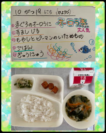 『まぐろのオーロラ煮』は、しょうが汁、料理酒で下味をつけたまぐろにでんぷんをまぶして揚げ、ケチャップ、砂糖、赤みそで作ったタレをからませて仕上げています。子ども達に大人気の献立の一つです。