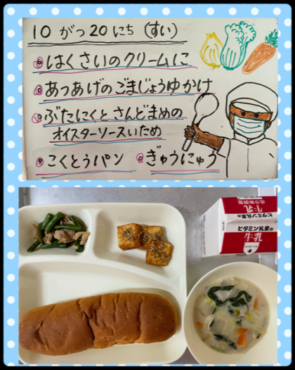 『はくさいのクリーム煮』は、鶏肉、はくさい、たまねぎ、チンゲンサイ、にんじん、しいたけを使用し、牛乳とクリームを加え、でんぷんでとろみをつけた中華風のクリーム煮です。パン献立にとてもよく合う一品です。