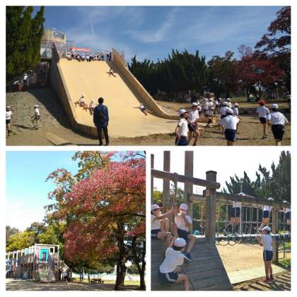 大泉緑地に着くと辺りには、大きな大きなすべり台や興味をそそる複雑な遊具、また色づいた樹々にバッタや鈴虫の音色など、子どもたちは十二分に楽しんでいました。 はしゃぎすぎて少し擦り傷などはありましたが、大きなケガもなくみんなで活動することができました。