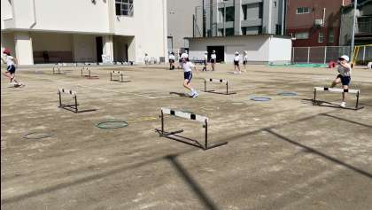3年3組の体育では、スピードを落とさずにハードルを走り越す方法をグループに分かれて考えていきました。パソコンで走り越す瞬間を撮影し、互いにアドバイスをしながら方法を見つけていきました。