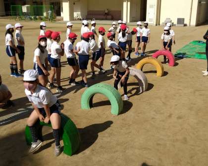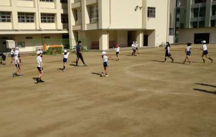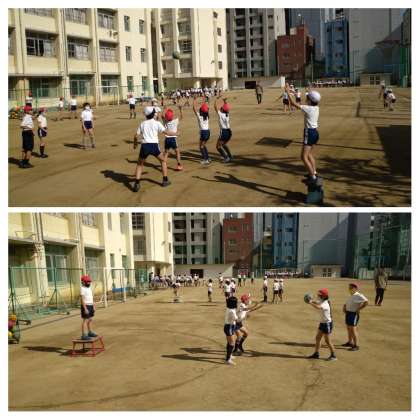 この日は体育館が使えなかったので、3クラスとも運動場を分担しながら活動しました。