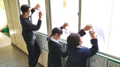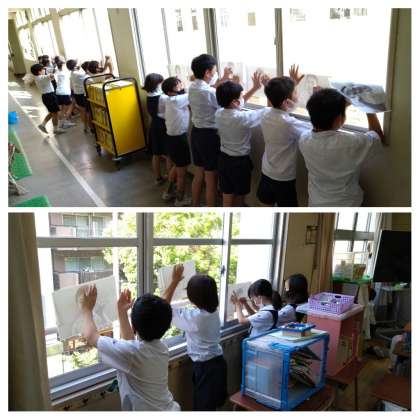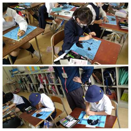 自分の顔あたりを写真に撮り、まずは薄い紙に写し描いていきました。窓にへばりつくようにすると、日光が挿し込んで絵が見えやすいようです。みんな窓に向かって大行列でした。