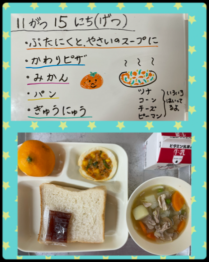『変わりピザ』は、ツナ、コーン、ピーマン、ピザソース、チーズを混ぜ合わせて、ぎょうざの皮にのせ、焼き物機で焼きます。子ども達に大好評な献立です。