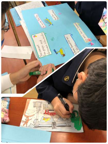 和英辞典を使って英語で説明したり、パソコンで有名な場所やおいしいものを調べてイラストも描いたりしているので、楽しいパンフレットが出来上がりそうです。