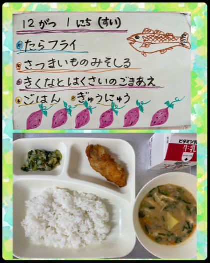 『さつまいものみそ汁』は、さつまいも、うすあげ、たまねぎ、にんじん、もやしを使用し、青みに青ねぎを使用しています。