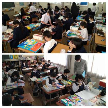 図工の時間には、絵の具を片手に、カラフルな街やビルを塗っています。今日のお手紙にも、5年生や他学年の紹介が載ってあります。