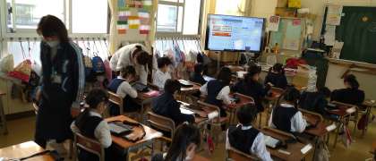 本校では2週間に1回ほど、ICT教育アシスタントと呼ばれる支援員が来られ、パソコン・タブレット端末の使い方や活用法をサポートしてくれています。