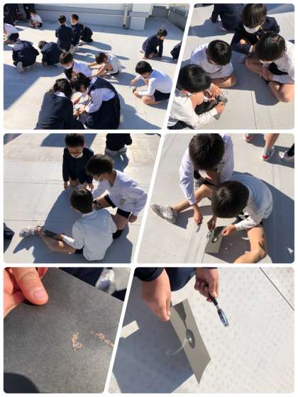 今日は、お天気が良かったので、屋上で日光を集める実験を行いました。