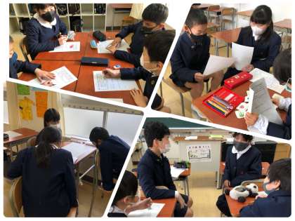 その後、提示されたある場面について「こんな場合はどうする?」とグループやクラスで話し合いました。いろいろなことが考えられ、答えは一つではないけれども、その時その時で適切な行動ができるようになればいいなと思います。