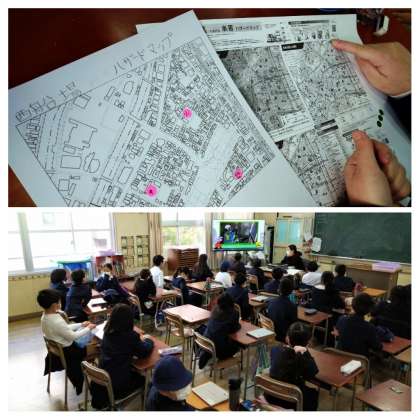 新聞紙など身近なものを使ってスリッパを作ったり、学校の備蓄倉庫に置いてある防災グッズを実際に見たり、西船場地域のハザードマップを調べたり、実際に被災地・避難所で起こった出来事について「自分だったら・どのような問題が起こるだろうか」と話し合い活動をしたり・・・