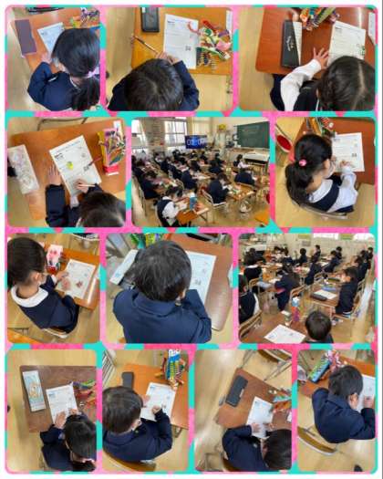 自分の作品を机に置き、みんなで鑑賞しました。作品には作品の名前や、頑張ったところや工夫したところも紹介されていました。