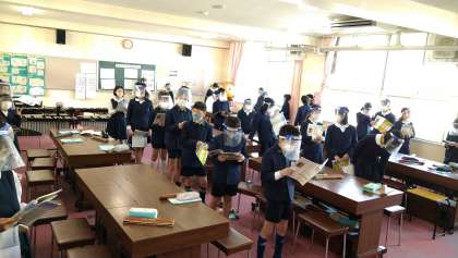 音楽の授業では、フェイスシールドを着用するなど感染対策を講じながら器楽や歌唱をしています。