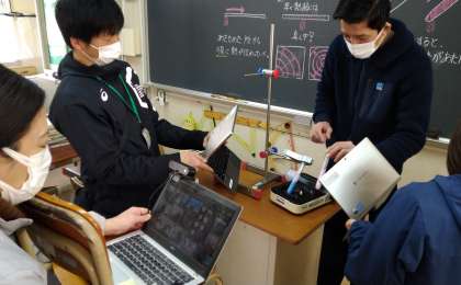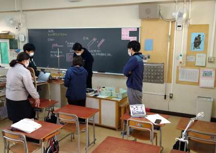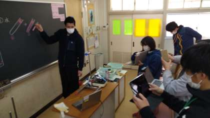 黒板で進行をし、実験のサポートや補助をしたり、パソコンで画面を映したりチャットに返信したりしながら、みんなで一緒に授業をしました。実験の様子が伝わったかな??