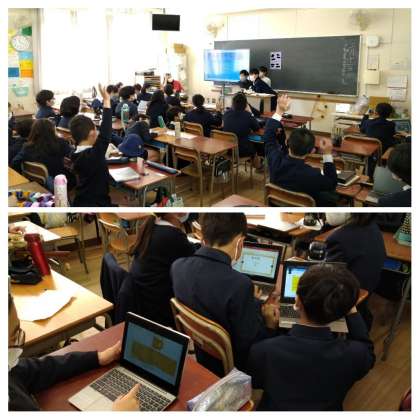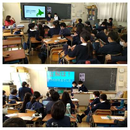 国語では、小さくも広い日本各地の方言を調べ、クイズ形式でみんなと学んでいます。中にはパワーポイントの使い方やアニメーションをふんだんに使っている子もいて、活発な交流となりました。