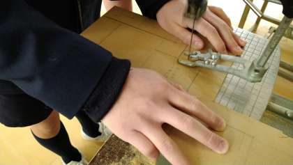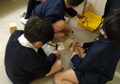 電動糸のこぎりを使って慎重に木片を切ったり削ったりし、それをボンドや釘で組み立てています。廊下中に金づちで叩く音が響き渡り、残り少ない時間を精一杯に活用しています。仕上がりのほどは・・・いかに!?