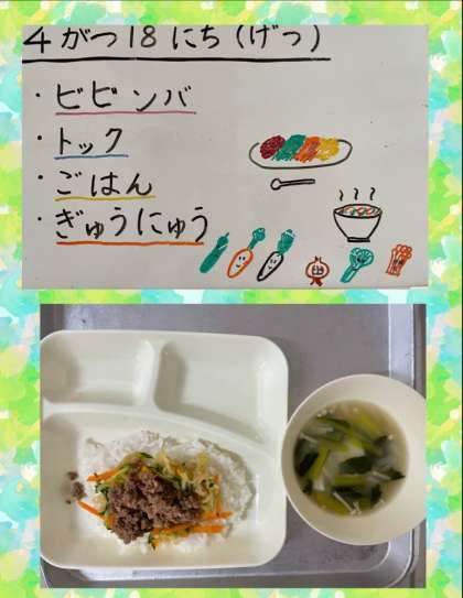 『ビビンバ』は、韓国・朝鮮の料理です。春のビビンバは大根の代わりに切干し大根を使用しています。子ども達に大人気の献立です。