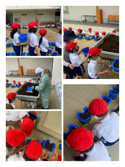 種のまき方を学級でしっかり確認してから、指で土に穴をあけ、穴に一つずつ種をまき、ふかふかのおふとんをかけてあげるように土をかぶせました。芽が出て、アサガオの花が咲くのがいまからとても楽しみです。