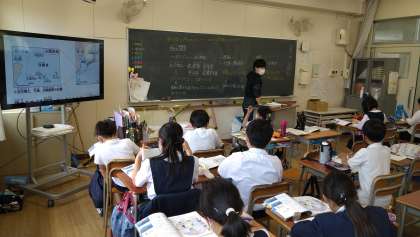 社会科では、大型テレビに地図やグラフを映し、単に知識を覚えるだけではなく世界の情勢を踏まえながら、子どもと一緒に考えながら学んでいます。