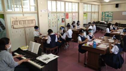 音楽では、フェイスシールドなど対策を講じながら、リコーダーにも親しんでいます。高学年になり、スピーディーな曲調やシャープなどの難しい音程を奏でることも増えてきました。