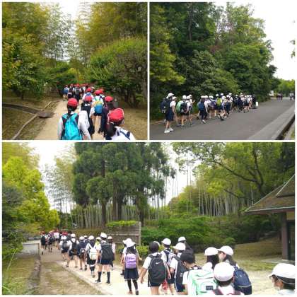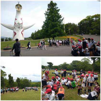 1時間をかけて万博記念公園に着くと、かの有名な「太陽の塔」とともにクラス写真を撮り、いよいよグループ活動のはじまりです!