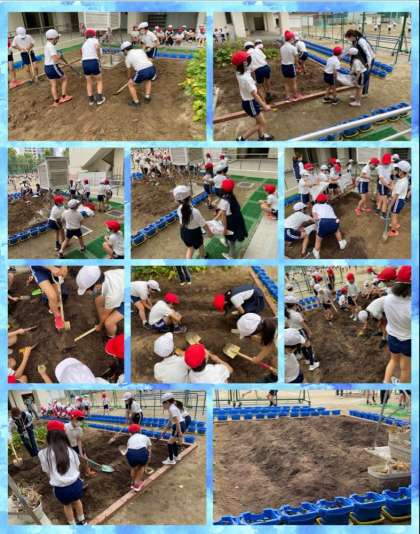 2組が、新しい土をたして、腐葉土と混ぜ合わせ、うねを作りました。