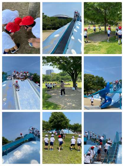 八幡屋公園では、おおきなジンベイザメのすべり台で遊んだり、お友達とおにごっこやだるまさんが転んだをしたりと元気いっぱい遊びました。