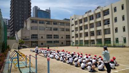 学年の人数が多いこともあり、4列に並ぶだけでも端から端まで長くなってかなり難しいこともありましたが、そこはさすが2年生! 練習を重ねるごとに、数十秒で並べるようになりました。