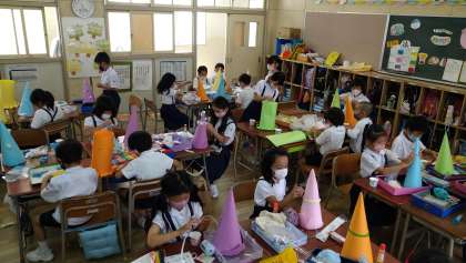 教室に飾っている「ふしぎなたまご」に引き続き、今度は「ふしぎなぼうし」の製作に取り掛かっています。