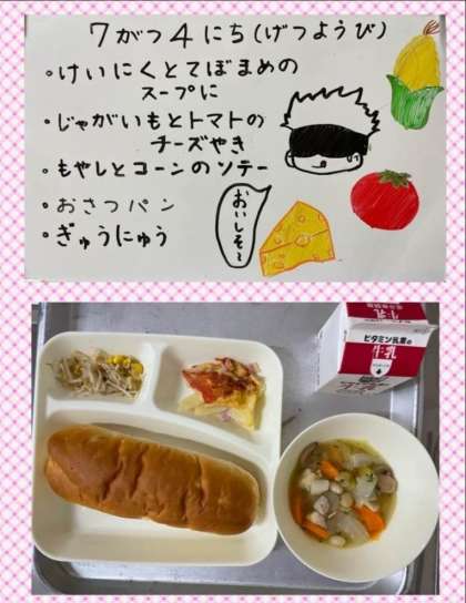 『じゃがいものトマトのチーズ焼き』は、子ども達に好評な献立で、生のトマトを使用しています。下味をつけたベーコンとじゃがいも、トマトにチーズをのせて焼き物機で焼きます。