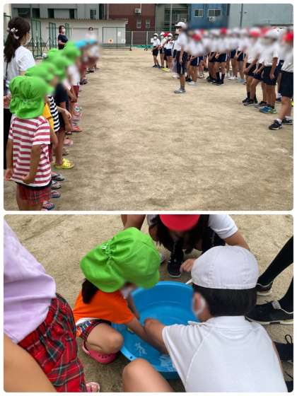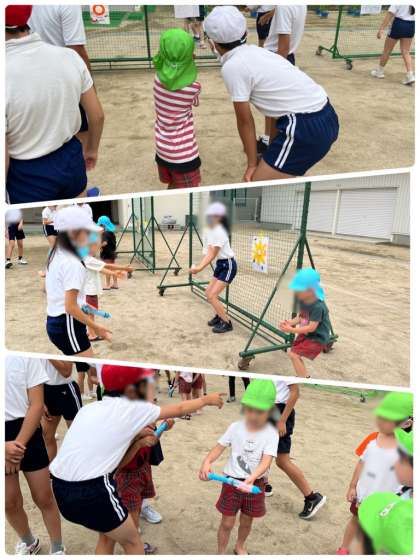 6年生と水鉄砲や水風船で遊びました。6年生手作りの的は園児たちにも人気で、狙いを定めて上手に打っていました。