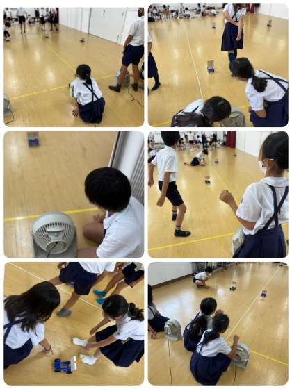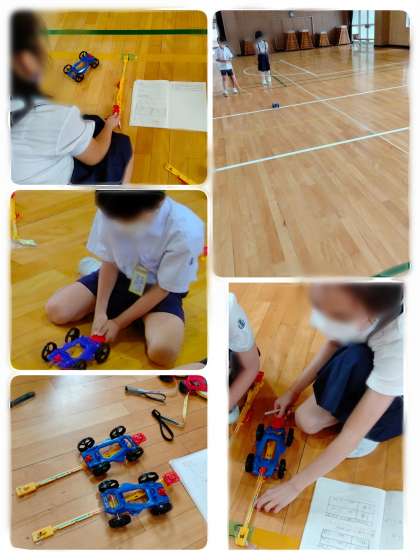 みんなで協力しながら車の進んだ距離をはかり、それぞれ結果を出しました。