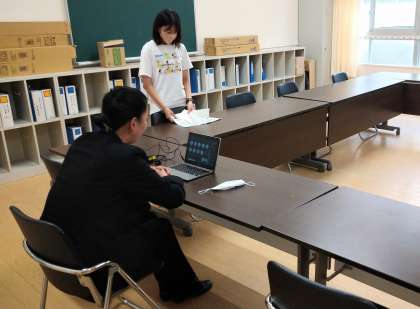 週はじめには全校朝会を行っていますが、夏場は気温が高いということもあってTeamsも活用しています。新校舎2階の会議室から、校長先生があいさつをしています。