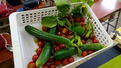夏真っ盛りなこともあり、運動場の学習園で実っていた夏野菜を収穫していました。ミニトマトや大きく育ったキュウリなど、たくさん成っていました。