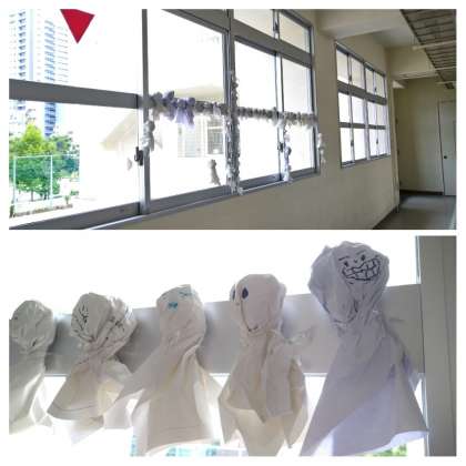 廊下を歩いていると、窓に何かたくさんのものが並んでいました。よく見てみると・・・手作りの「てるてるぼうず」です! お祭りやイベントもたくさんあり、みんな夏を楽しみにしていますね。