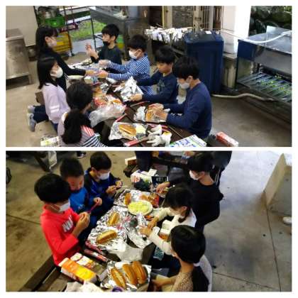 時おり吹く強い風に負けないよう、班で協力しながら、キャベツを乗せたりアルミホイルで巻いたりしました。