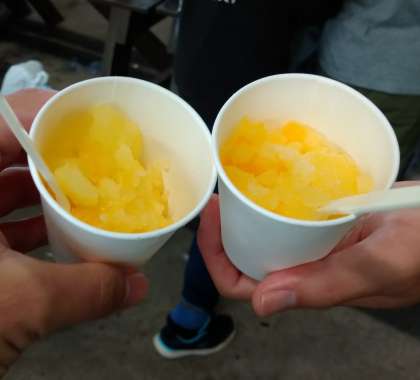 みかんの果肉とジュースは、シャーベット状となって冷えた容器のフチに付き、スプーンで削いでいきます。