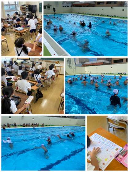 プールでは、チーターのように速く走ったり、ぷかぷか浮いたり楽しく活動しています。初めてのタブレットでは、電源のつけかたやパスワード入力などの操作をしました。「すごい!」とワクワクしながら進めていました。国語ではカタカナの学習も始まっています。