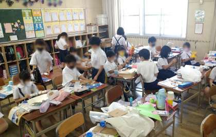 生活科では、家から材料を持ってきていただき、さまざまな「おもちゃ」作りに取り組んでいます。中にはうまく作れなかったり動かなかったりすることもありますが、自然と友だちと教え合う姿もみられます。